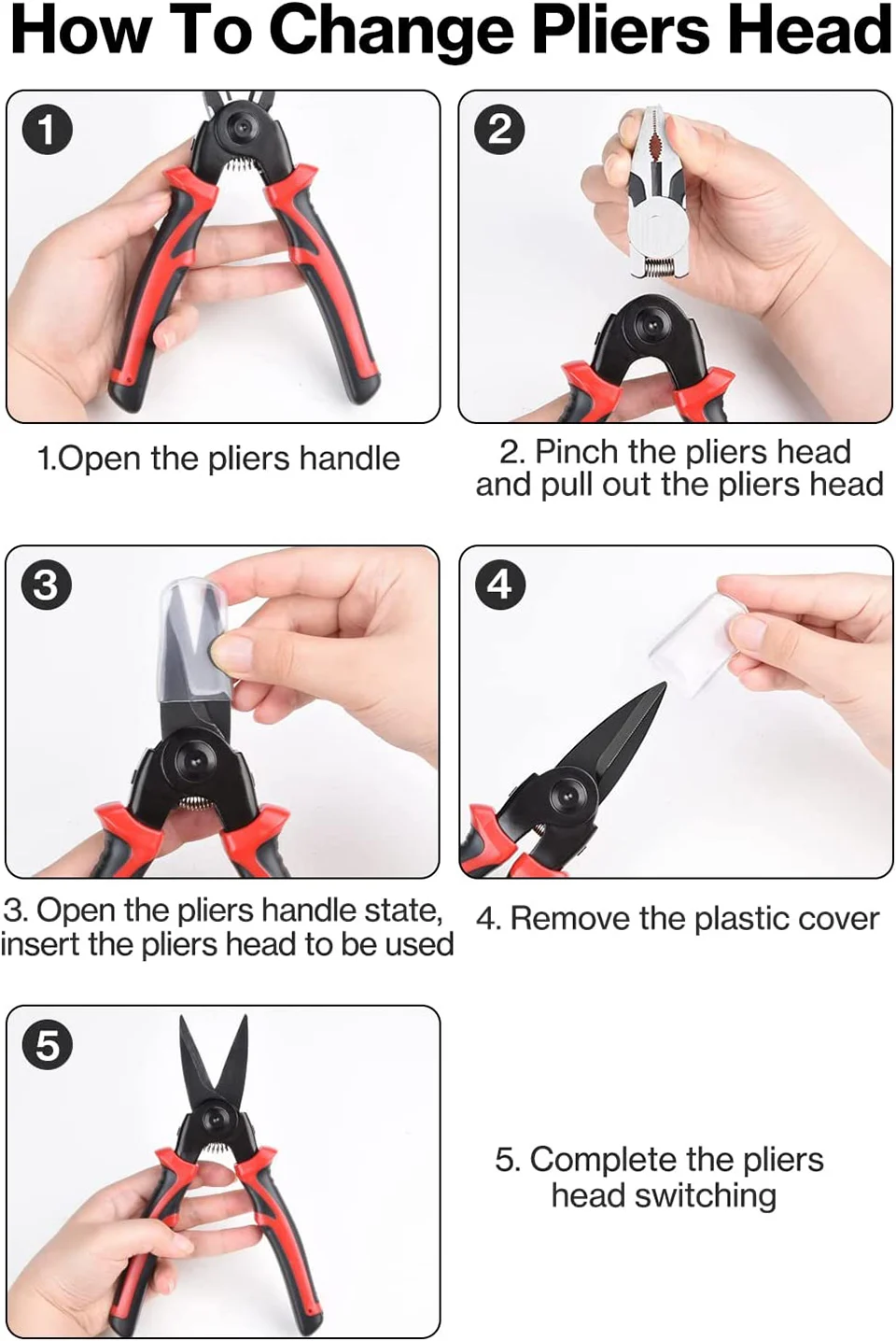 Five in one multifunctional head changing pliers: Needle nose pliers, Wire cutting pliers, wire stripping pliers, Wire pliers, Crimping pliers