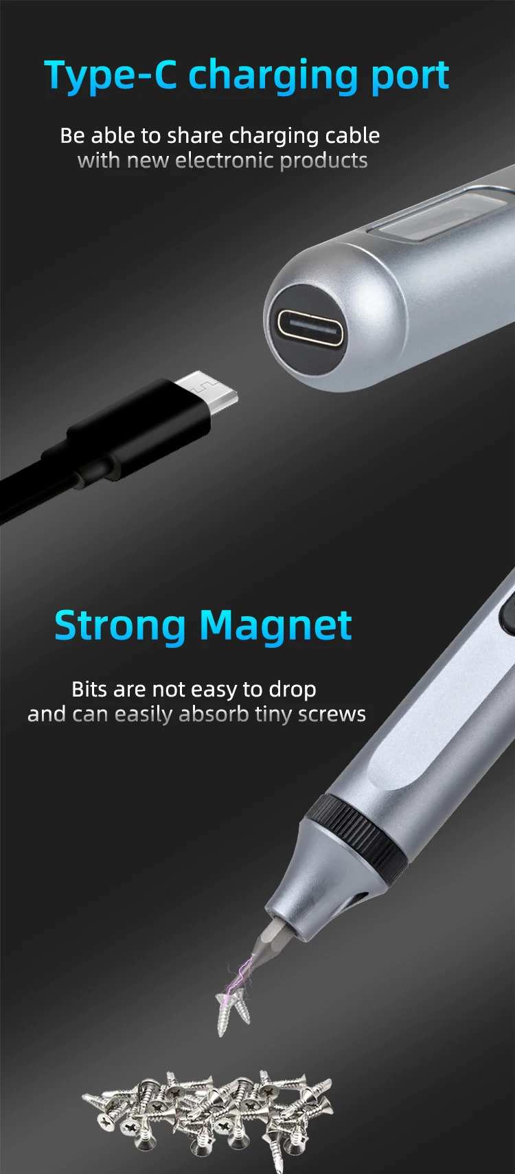 Alça antiderrapante giratória A alça magnética é feita de liga de alumínio com uma superfície antiderrapante ondulada que pode caber facilmente no seu dedo e proporcionar uma sensação confortável de mão.Há uma tampa na parte superior com um corpo que gira de forma independente, permitindo girar a chave de fenda usando apenas o polegar e o dedo médio.A cabeça do eixo da chave de fenda tem um ímã forte integrado que facilita a instalação da broca, a ponta da chave de fenda magnética também pode sugar facilmente pequenos parafusos